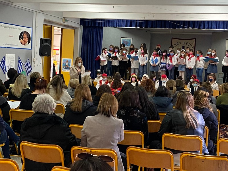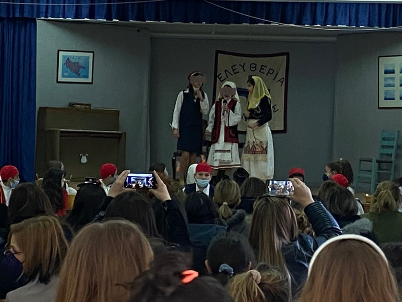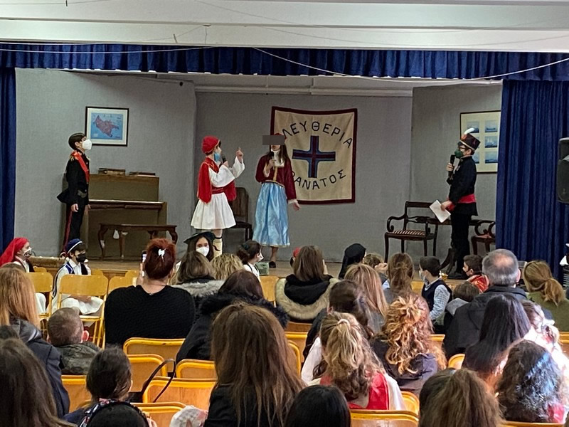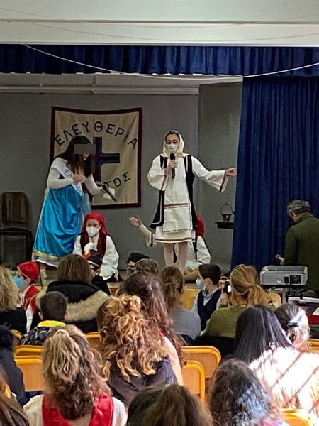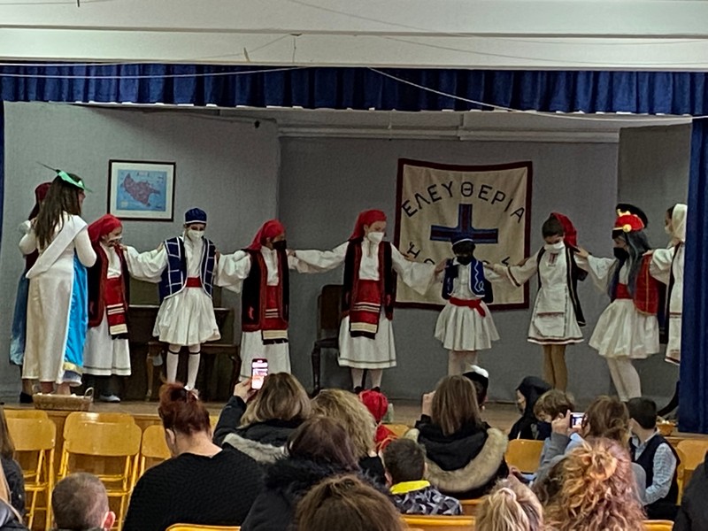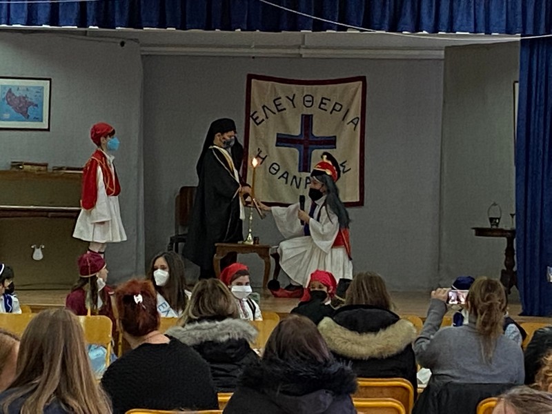 Τα δύο τμήματα της Ε΄ τάξης παρουσίασαν αφηγηματικές και δραματοποιημένες στιγμές της επανάστασης του 1821 και μαζί με τη χορωδία του σχολείου ενθουσίασαν τους παρευρισκόμενους μαθητές, γονείς και εκπαιδευτικούς.