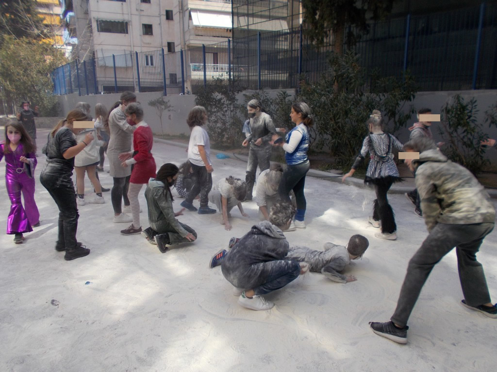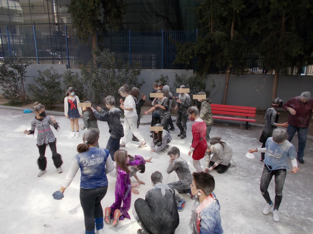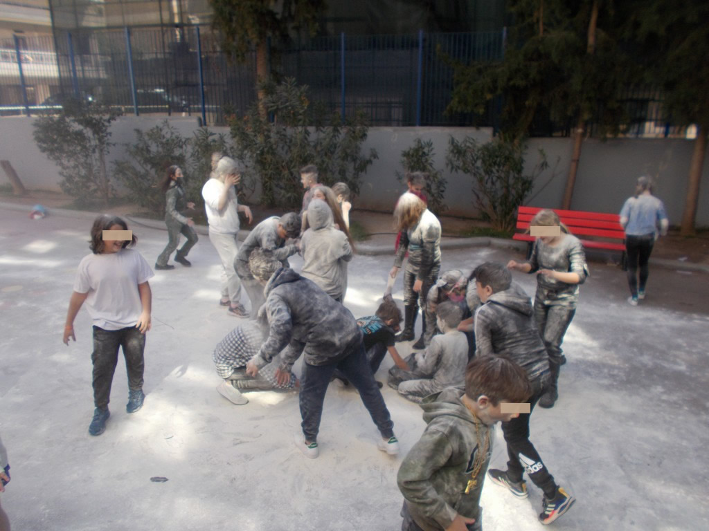 Η γιορταστική μέρα έκλεισε με αλευροπόλεμο από τους μαθητές της ΣΤ τάξης να παίζουν !