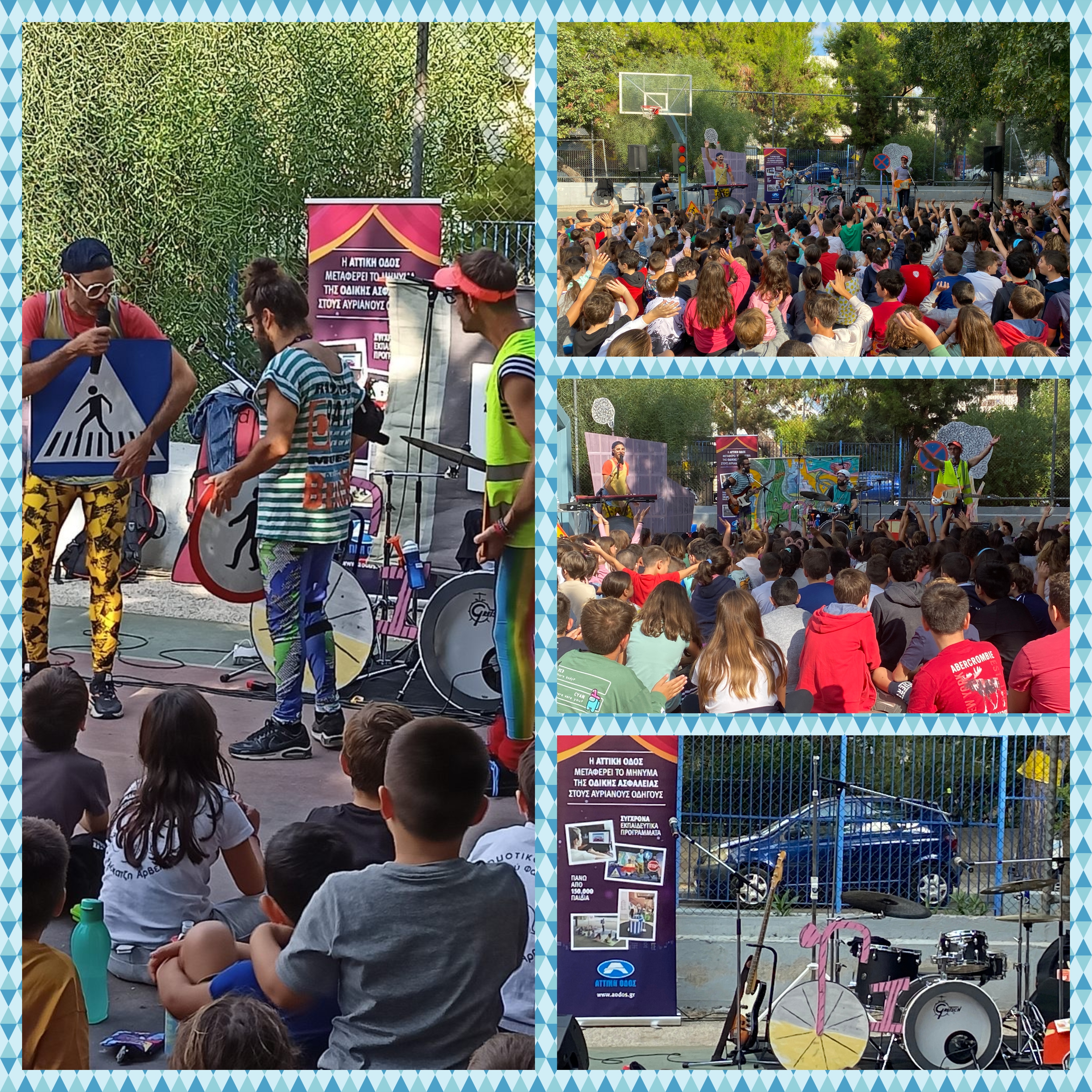 Οι «Τροβαδούροι της Ασφάλτου», μια μουσικοχορευτική παράσταση με το συγκρότημα “Burger Project” ταξίδεψαν τους μαθητές μας με διασκεδαστικό τρόπο, μέσα από απολαυστικούς διαλόγους, ζωντανή μουσική, τραγούδια αλλά και έξυπνα δρώμενα και τους υπενθύμισαν βασικούς κανόνες ασφάλειας στο δρόμο. Οι μαθητές μας συμμετείχαν ενεργά και με ενθουσιασμό σε όλη τη διάρκεια της εκδήλωσης, θυμήθηκαν ποια ποδηλατικά εξαρτήματα δεν πρέπει ποτέ να ξεχνούν για την ασφάλειά τους, αναγνώρισαν γνωστά σήματα οδικής κυκλοφορίας, τραγούδησαν μεταξύ άλλων για το αγαπημένο τους ποδήλατο, αλλά και για τα δύο «φωτεινά ανθρωπάκια» στο φανάρι, έμαθαν πώς να περπατούν γρήγορα αλλά προσεκτικά με τον «κύριο Πρασινούλη» και να περιμένουν υπομονετικά παρέα με τον «κύριο Κοκκινούλη».