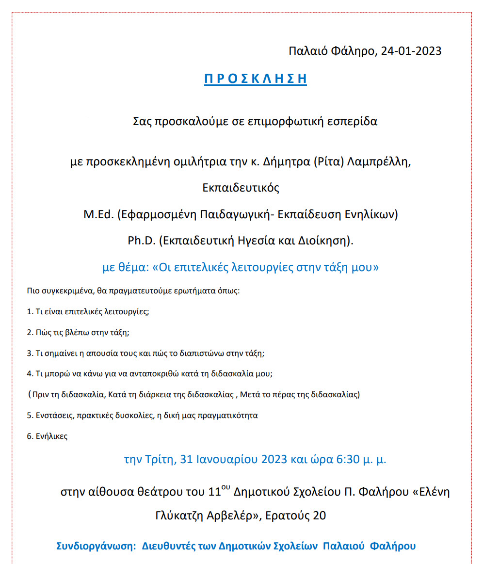 Η εσπερίδα συνδιοργανώνεται από τους Διευθυντές των Δημοτικών Σχολείων Παλαιού Φαλήρου.