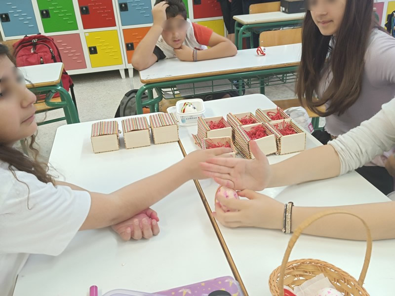 Ένα ξύλινο χρωματιστό κουτάκι το γεμίσαμε με διακοσμητικά, πασχαλινά σοκολατάκια κι ένα κόκκινο γυαλιστερό αυγό και το πασχαλινό μας δώρο ήταν έτοιμο. Ετοιμάσαμε αντίστοιχα δωράκια και για τα "πρωτάκια" μας του Α1 αφού ευχηθήκαμε τόσο στα παιδιά όσο και στη δασκάλα τους "Καλό Πάσχα".