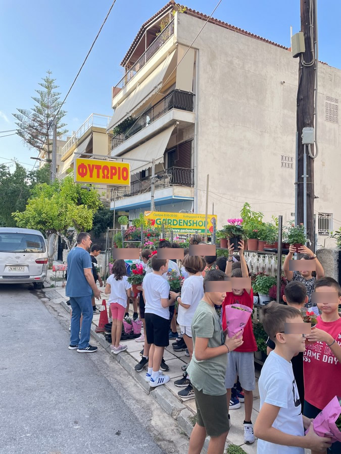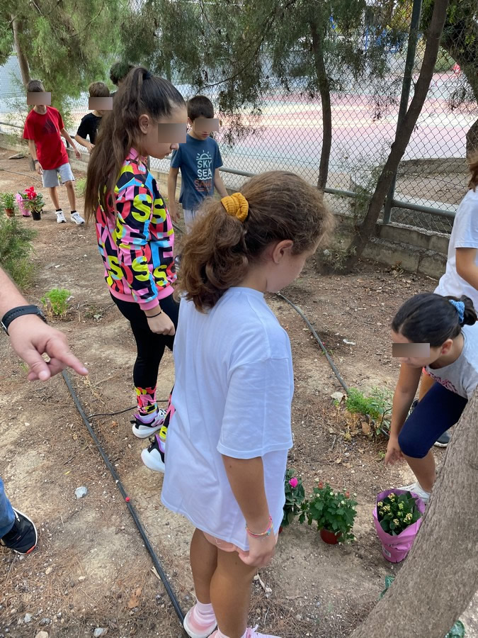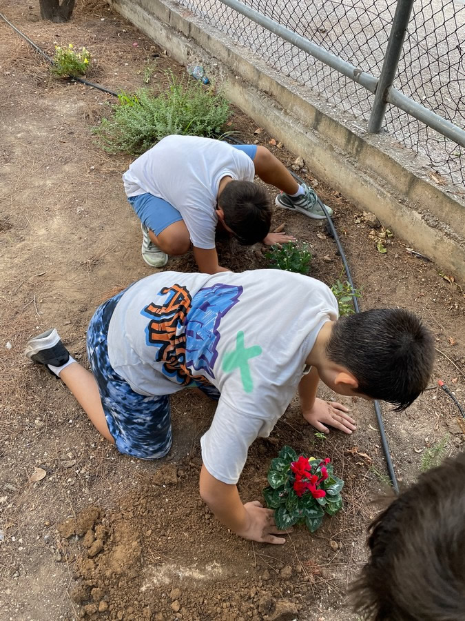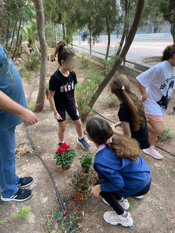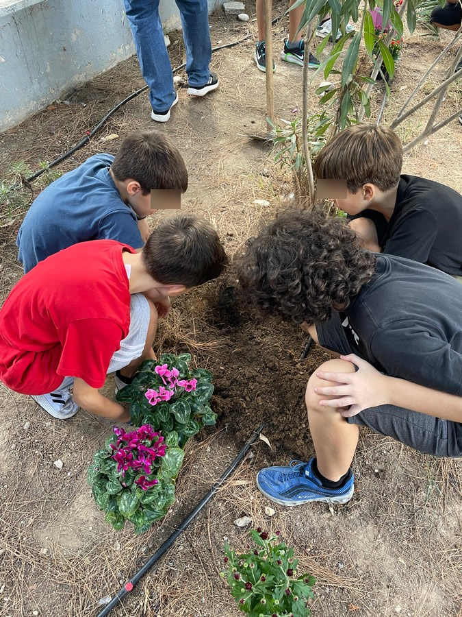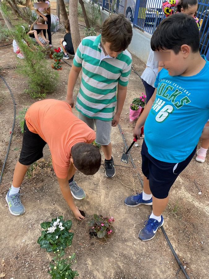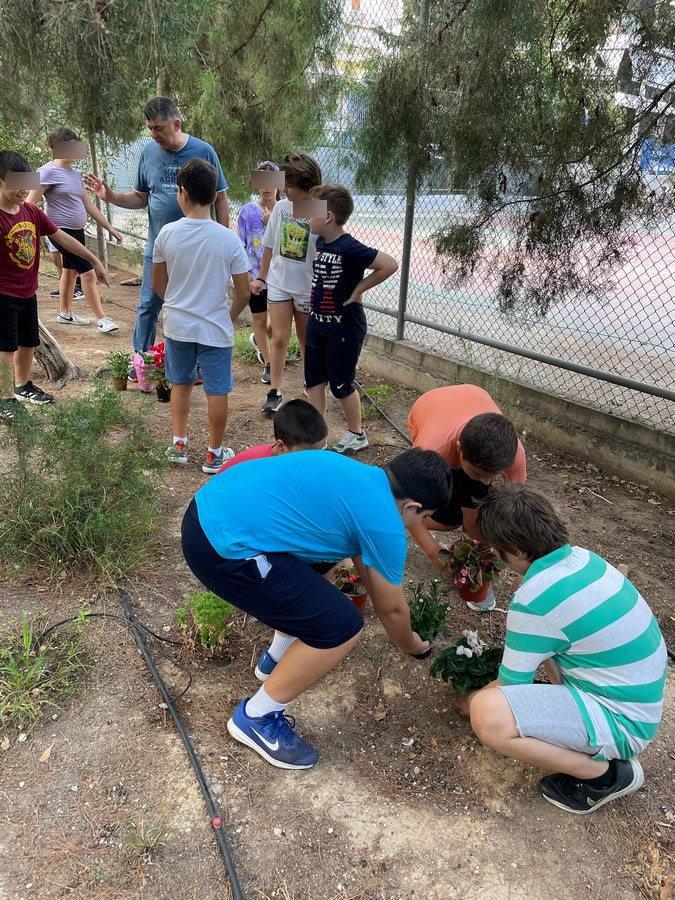 Η πέμπτη τάξη ανέλαβε να συνεχίσει την καλλιέργεια και την φροντίδα του κήπου που είχαν οι προηγούμενες πέμπτες και έκτες τάξεις. Αφού πήγαμε τα παιδιά και των δύο τμημάτων Ε΄ τάξης στο γειτονικό μας φυτώριο, πήραμε χρυσάνθεμα, κυκλάμινα, γαρυφαλάκια και άλλα φυτά και βέβαια χώμα, εμπλουτισμένο με λίπασμα.
