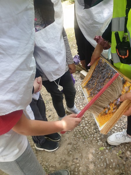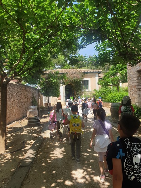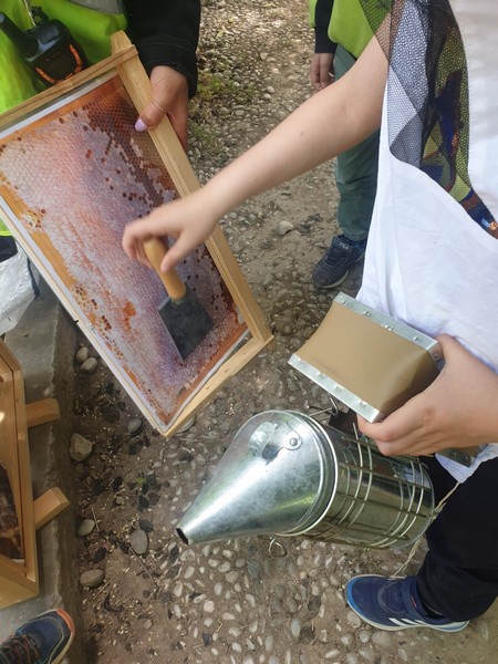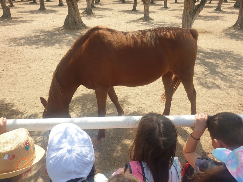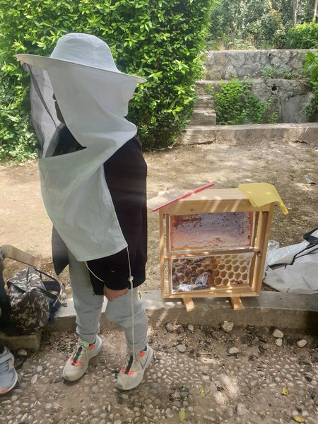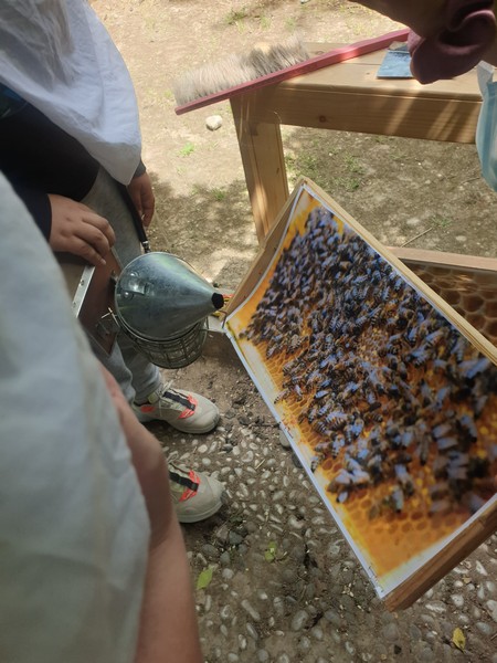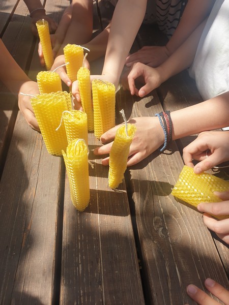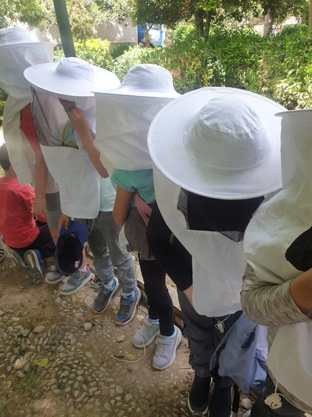 Αφού περιπλανηθήκαμε στους κήπους του κτήματος και είδαμε παπαγαλάκια, άλογα, ελιές, αμπέλια και ένα σωρό βότανα, πήγαμε σε μια αίθουσα και μέσω ενός βίντεο μάθαμε πολλές πληροφορίες για τις μέλισσες. Παίξαμε ένα θεατρικό και διαπιστώσαμε πώς ακόμα και οι θεοί του Ολύμπου είχαν καταλάβει το σημαντικό έργο των μελισσών. Ύστερα, φτιάξαμε ένα κερί από αληθινό κερί μέλισσας και μετά πήγαμε να δούμε σε μια κυψέλη πώς ο μελισσοκόμος παίρνει το μέλι. Βάλαμε τα καπελάκια μας, πήραμε τα σωστά εργαλεία κι αρχίσαμε τη δουλειά. Ήταν καταπληκτικά!