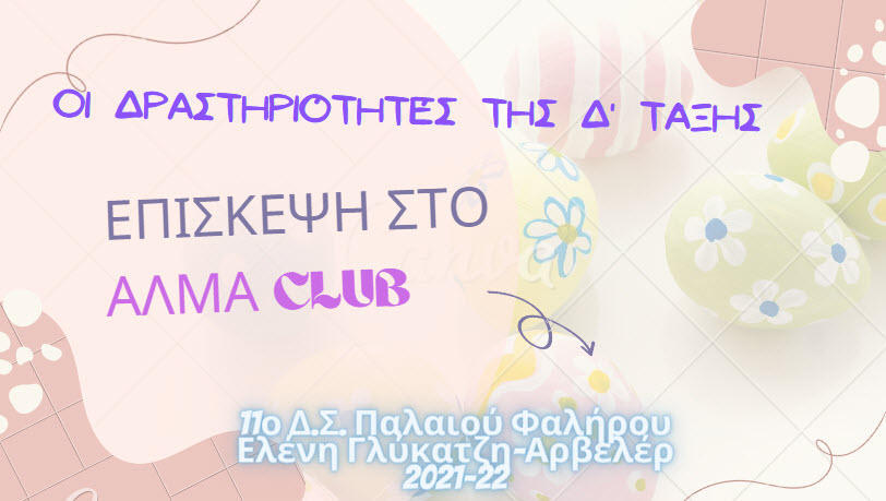 Τα τεταρτάκια μας εξόρμησαν δημιουργικά φέτος την άνοιξη. Επισκέφτηκαν το Alma club Αλίμου συμμετέχοντας σε πρόγραμμα αναβίωσης πασχαλινών εθίμων και το Πολεμικό Μουσείο, όπου είχαν την ευκαιρία να δουν λαμπρά εκθέματα και να θαυμάσουν το διαχρονικό μεγαλείο του Ελληνισμού. Τα παιδιά συνόδεψαν οι δασκάλες των τμημάτων, Παπαδοπούλου Βούλα (Δ1), Ξυνιά Θεανώ, Κουτλή Βικτώρια (Δ2). Δείτε τις δράσεις μας στα βίντεο που ακολουθούν:
