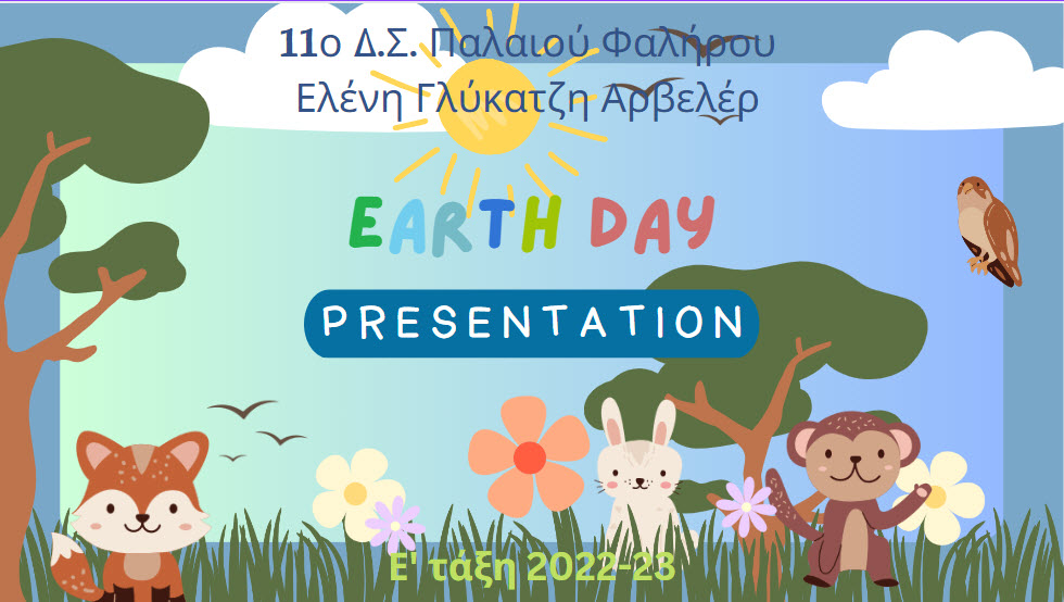 Οι μαθητές και οι μαθήτριες της Ε' τάξης του σχολείου μας δημιούργησαν με τη βοήθεια των Νέων Τεχνολογιών την συνεργατική παρουσίαση "Earth Day" αφιερωμένη στην Παγκόσμια Ημέρα Περιβάλλοντος που γιορτάζεται κάθε χρόνο στις 5 Ιουνίου. Δούλεψαν εξ' αποστάσεως προτείνοντας πρωτότυπες ιδέες για την προστασία και φροντίδα του περιβάλλοντος. Κλικ στην εικόνα για να δείτε την παρουσίαση.