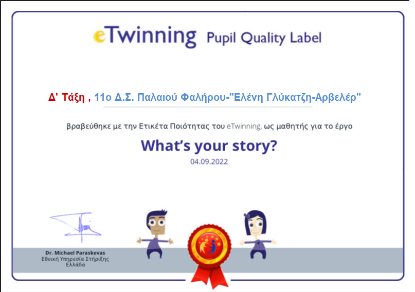 Τα προγράμματα για την ευρωπαϊκή δράση συνεργασίας μεταξύ σχολείων eTwinning, που υλοποιήθηκαν κατά το περσινό σχολικό έτος 2021-2022 στο σχολείο μας τιμήθηκαν με τη διάκριση "Ετικέτα Ποιότητας". Το πρόγραμμα "What's your Story?" με θέμα μύθους και παραδοσιακές ιστορίες από την Ευρώπη υλοποίησαν οι μαθητές των Δ1 & Δ2 τμημάτων με την καθοδήγηση της εκπαιδευτικού Μαρίας Λογγινίδου. Το πρόγραμμα "H.O.P.E.-Have Only Positive Energy" που αφορούσε τη θετική στάση ζωής και τη θετική δράση ολοκλήρωσαν οι μαθητές των ΣΤ1& ΣΤ2 τμημάτων με την καθοδήγηση των εκπαιδευτικών Ελένης Μακρυαλέα & Μαρίας Λογγινίδου.