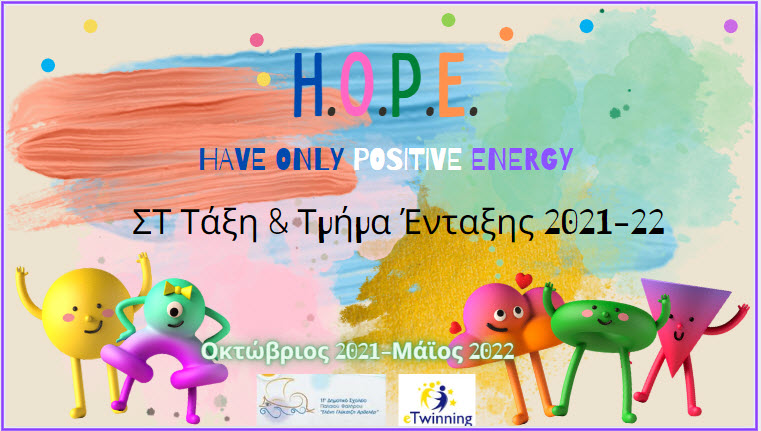 To πρόγραμμα eTwinning "H.O.P.E.-Have Only Positive Energy" που υλοποιήθηκε φέτος από τους μαθητές των ΣΤ1 & ΣΤ2 τμημάτων του σχολείου μας ολοκληρώθηκε. Το πρόγραμμα αφορούσε τη Θετική Σκέψη και Δράση και το μέλλον των σχολείων όπως τα οραματίζονται οι μαθητές μας. Το πρόγραμμα διήρκεσε 8 μήνες και συμμετείχαν σε αυτό 11 σχολεία από 6 χώρες (Ελλάδα, Γαλλία, Πολωνία, Κροατία, Μολδαβία και Τουρκία). Βασικές έννοιες που θίχτηκαν στην πορεία ήταν η αυτοεκτίμηση, αυτοσεβασμός, αποδοχή και αλληλεγγύη προς τους άλλους. Στη διάρκειά του οι μαθητές μας συνεργάστηκαν με τους μαθητές των υπολοίπων σχολείων για να δημιουργήσουν κοινά έργα, να επικοινωνήσουν και να μοιραστούν εμπειρίες, αναπτύσσοντας γλωσσικούς, ψηφιακούς και κοινωνικούς γραμματισμούς. Υπεύθυνες για το πρόγραμμα ήταν οι εκπαιδευτικοί Μαρία Λογγινίδου (εκπ/κος Αγγλικής Γλώσσας) και Έλενα Μακρυαλέα (εκπ/κός Ειδικής Αγωγής).
