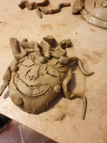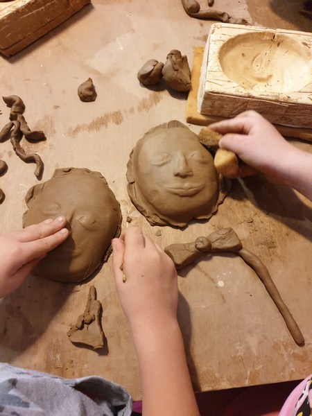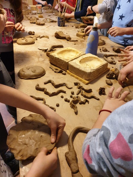 Στη συνέχεια χωριστήκαμε σε δύο μεγάλες ομάδες και πήγαμε να δουλέψουμε με τον πηλό πάνω σε δύο πολύ μεγάλα τραπέζια. Αφού ακούσαμε τις οδηγίες για τα καλούπια και τα διάφορα εργαλεία, τα χέρια μας πιάσαν δουλειά. Το αποτέλεσμα ήταν πολύ ωραίο.