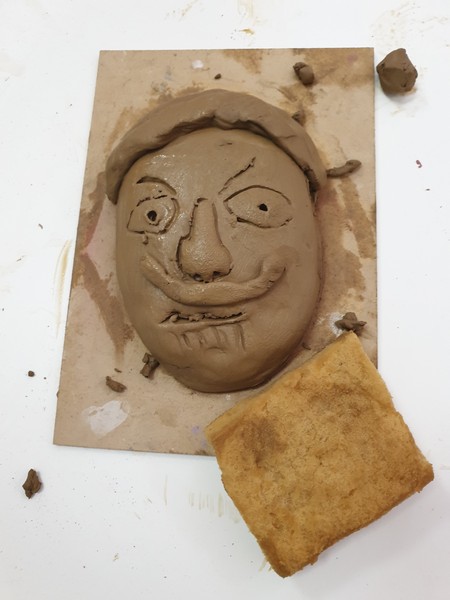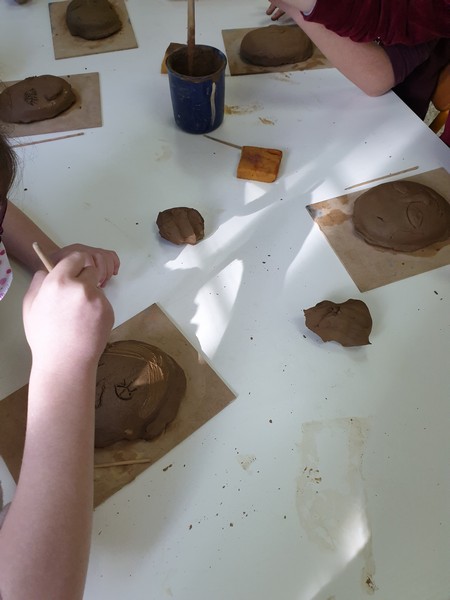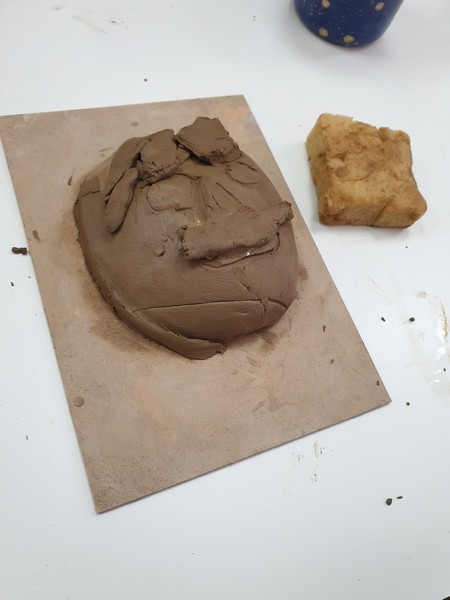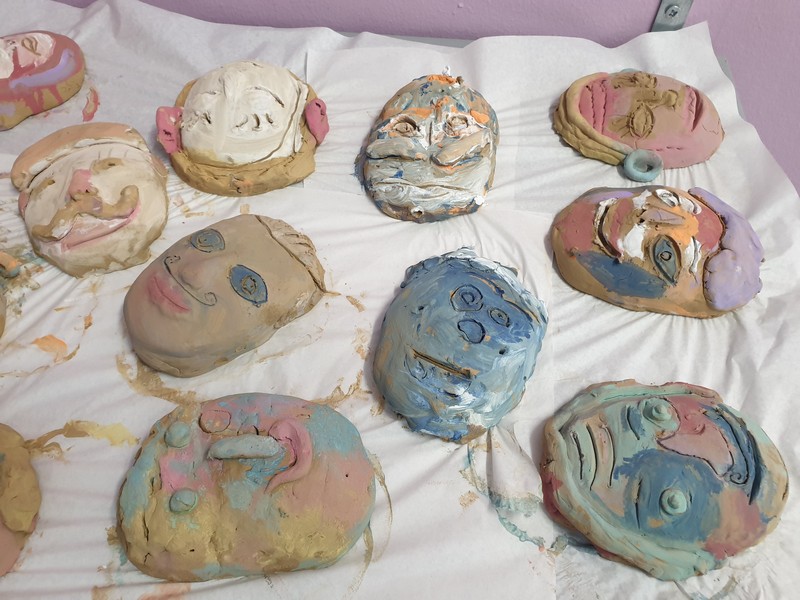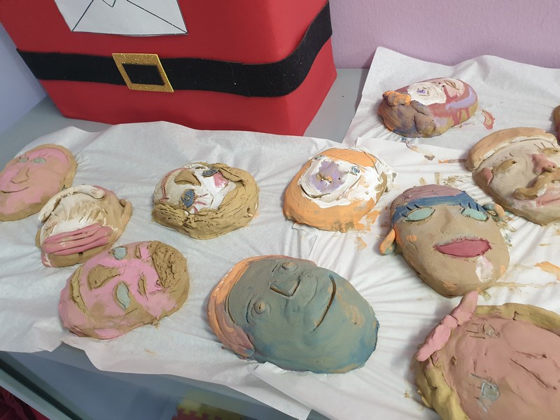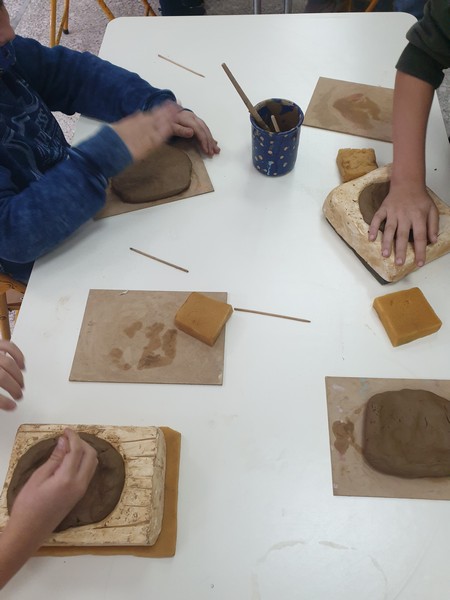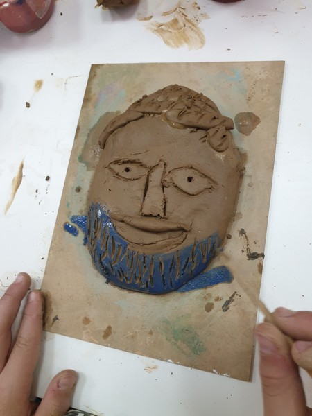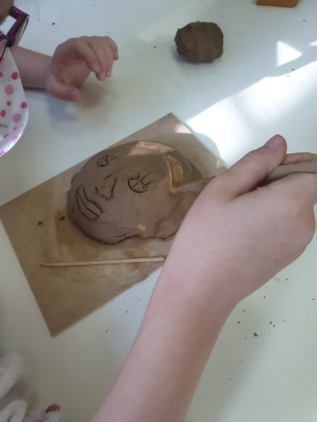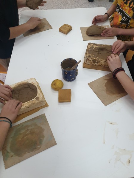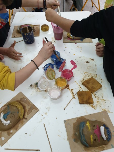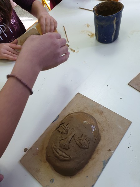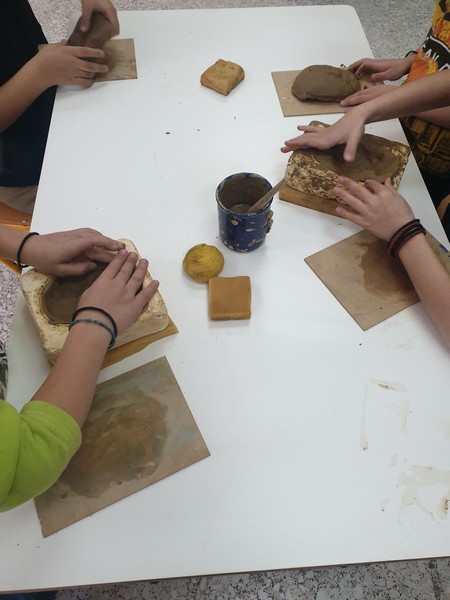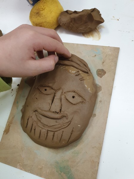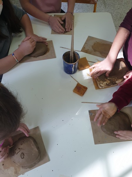 Κάτσαμε στα τραπεζάκια μας και αρχίσαμε να πιάνουμε με τα χέρια μας ένα κομμάτι πηλού και να το επεξεργαζόμαστε. Νιώσαμε περίεργα μερικοί, γιατί δεν είχαμε ανάλογη εμπειρία πρωτύτερα. Μας έμαθε πώς να χρησιμοποιούμε το καλούπι κι αφού πάρει το σχήμα που θέλουμε ο πηλός μας να φτιάξουμε τα χαρακτηριστικά της μάσκας μας. Με ένα μικρό ξυλάκι κάναμε τις λεπτομέρειες, αλλά όλη τη δουλειά έγινε με τα χεράκια μας.