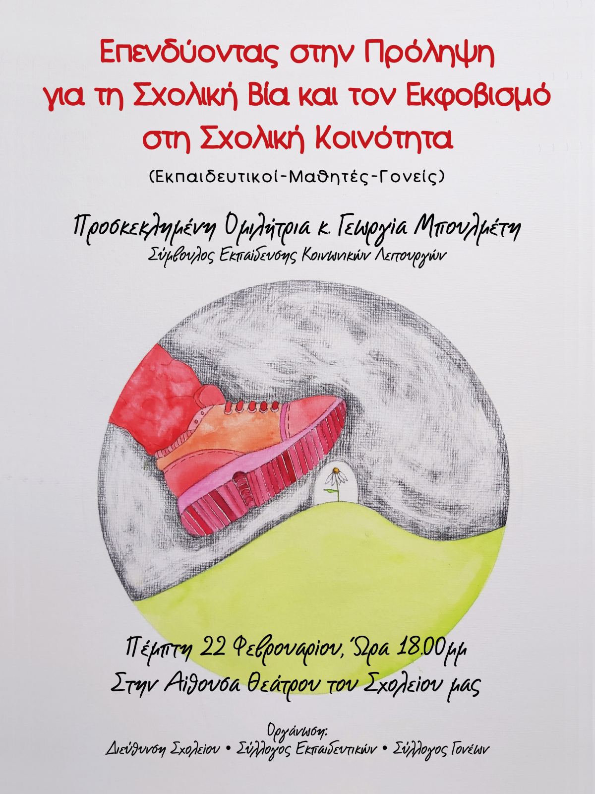 Την Πέμπτη 22 Φεβρουαρίου 2024 και ώρα 18:00 στην Αίθουσα Εκδηλώσεων του Σχολείου μας θα πραγματοποιηθεί σεμινάριο με εισηγήτρια την κυρία Γεωργία Μπουλμέτη (Σύμβουλο Εκπαίδευσης Κοινωνικών Λειτουργών) με θέμα "Επενδύοντας στην πρόληψη για τη σχολική βία και τον εκφοβισμό στη σχολική κοινότητα".